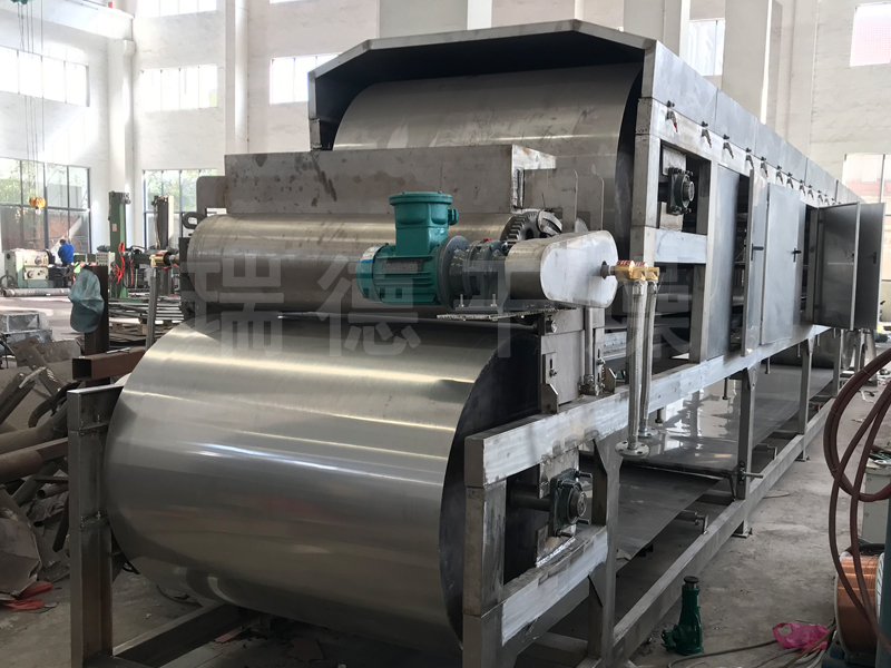 该机由液体变固体粒状,主要是通过造粒模头造粒,采用回转式钢带连续进行,通过喷淋水冷却定型。